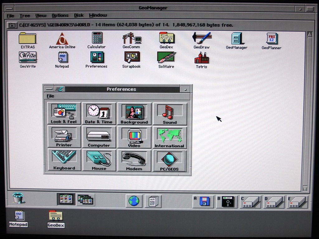 Díky Hannibalovi se mi podařilo na Sergeyově PC/XT vyzkoušet GeoWorks Ensemble 1.2. Je naprosto úžasné, že něco takového běhá i na PC/XT s 640 kB RAM. PC/GEOS vychází ze svojí 8-bitové verze a přináší vylepšení, jako jsou škálovatelné fonty a multitasking. Ve své době super systém s minimálními hardwarovými nároky a pěknou grafikou. Systém je stále vyvíjen a novější verzi Breadbox Ensemble můžete zakoupit za $99.95.