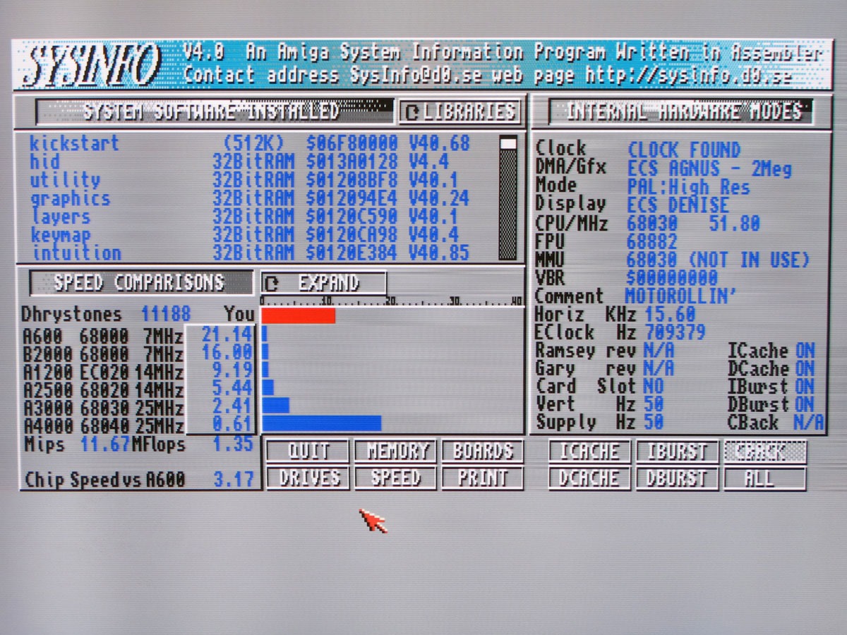 Zrychlení se kupodivu projeví i v běžném provozu Amigy. Předpokládám, že je to proto, že se odlehčilo na pomalé komunikaci mezi CPU, ECS čipsetem a relativně pomalou CHIP RAM.