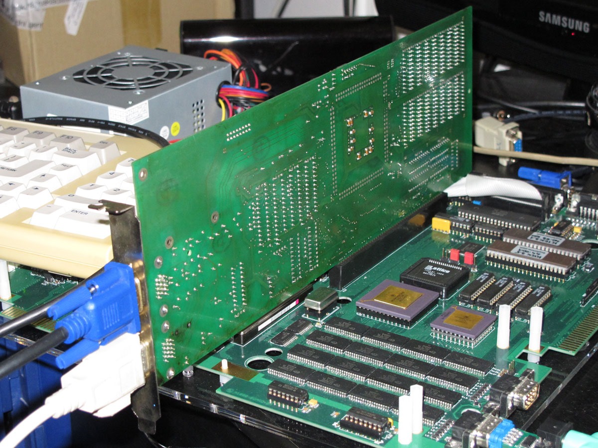 Jak už asi napověděl můj předchozí příspěvek, kde jsem se ptal na správnou orientaci CL-GD5428 (PQFP-160), tak kromě desky na rozšíření RAM pro GBA1000 o 32MB, se mi podařilo zakoupit i plošný spoj na grafickou kartu Picasso II upravenou pro GBA1000 tak, že se dá dovnitř počítače zabudovat naplocho. Kromě toho, je možné videosignál interním kabelem zapojit přímo do desky tak, že na VGA výstup je automaticky přepínán buď výstup interního VGA scandoubleru nebo Picasso II.