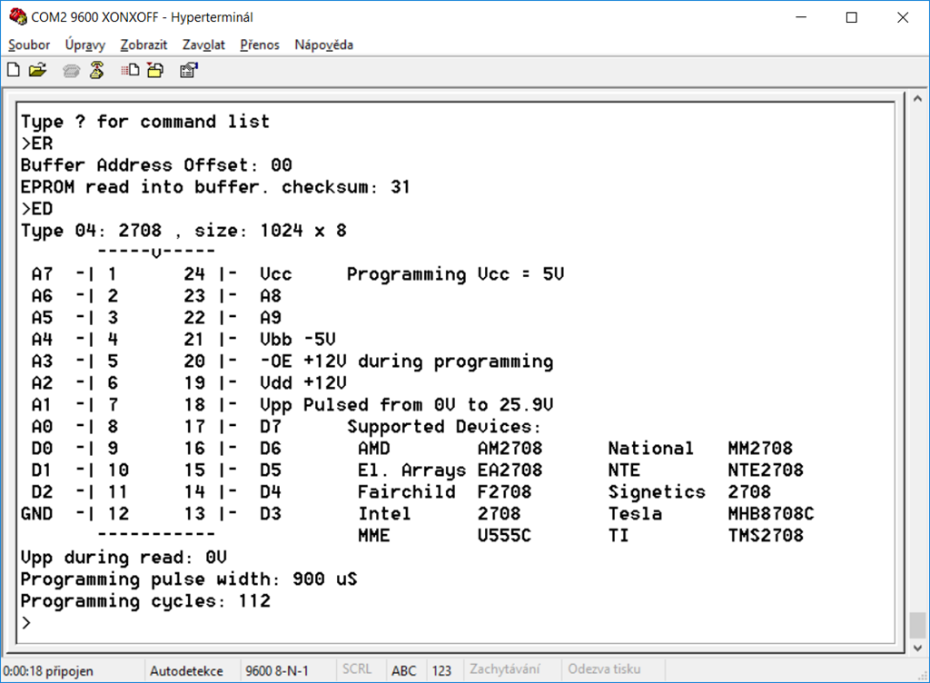 Programátor se připojuje k počítači přes sériovou linku a komunikuje rychlostí 9600 baud. Data se nahrávají přes Intel HEX nebo Motorola S-Record formáty. Na obsluhu vám stačí jakýkoli terminálový program, který umí posílat a zachytávat textové soubory. Vyzkoušel jsem postupně různé EPROM, co jsem doma vyhrabal. Začal jsem s 2708 – TESLA MHB2708C a to jak zlaté, tak jen keramické, pak Motorola MC2708L, TMS2708JL, ruské K573RF1 a samozřejmě i Intel C2708 a D2708. Vše bez chybičky. Pak jsem vyzkoušel také MHB2716C, TMS2516JL, K573RF5, TMS2532, HN462532G i MCM68764C, která je fakt exot, ale perfektně se hodí jako náhrada ROM pro ZX81. Jediné, na čem jsem trochu zasekl byly TM2532A, které jsou jiné než TMS2532 a programátor na ně vytrvale hlásil nízké programovací napětí. Zkusil jsem je u Bučka a tam mi ELNEC programátor hlásil příliš velký odběr proudu. Evidentně tedy byly EPROM vadné a Martinovi velký dík za to, že do svého programátoru zabudoval i proudovou ochranu. Konzultoval jsem to s ním a říkal, že je to u starších EPROM celkem běžné a právě proto tam ta ochrana je. V první verzi prý nebyla a několikrát mu to odprásklo spínací tranzistory.