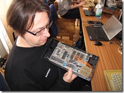 Vyráželi jsme společně s Radimem a Bohoušem z Brna okolo 14. hodiny, takže na místě jsme byli někdy před 17. hodinou. Pozdravili jsme se se spoustou známých tváří, které už byly na místě a jako obvykle jsme si donesli stůl, protože fakt bylo už celkem obsazeno, a roztáhli jsme svoje serepetičky. Já jsem vytáhnul SHARP MZ-700, MZ-800 a MZ-1500 na kterých jsem chtěl testovat a popřípadě dolaďovat firmware Unikarty a manažera. Bohouš vytáhnul Commodore C64 s prezentací svého nového prototypu ARMSIDu.