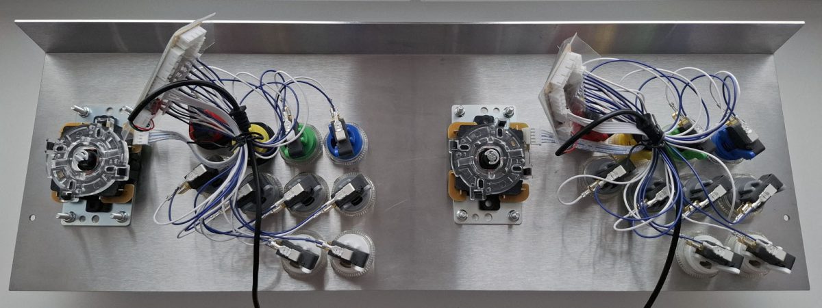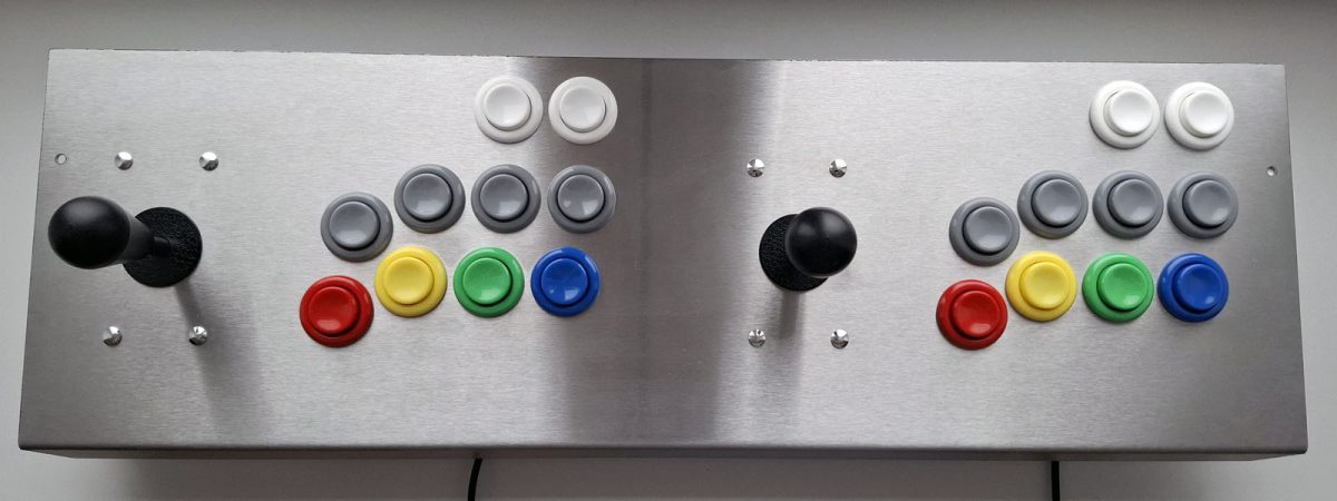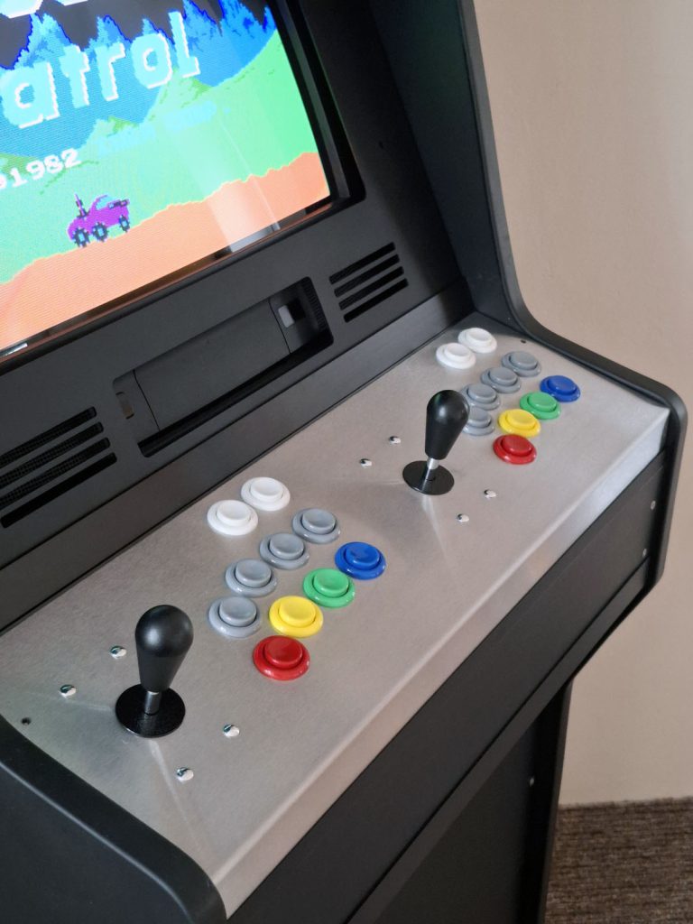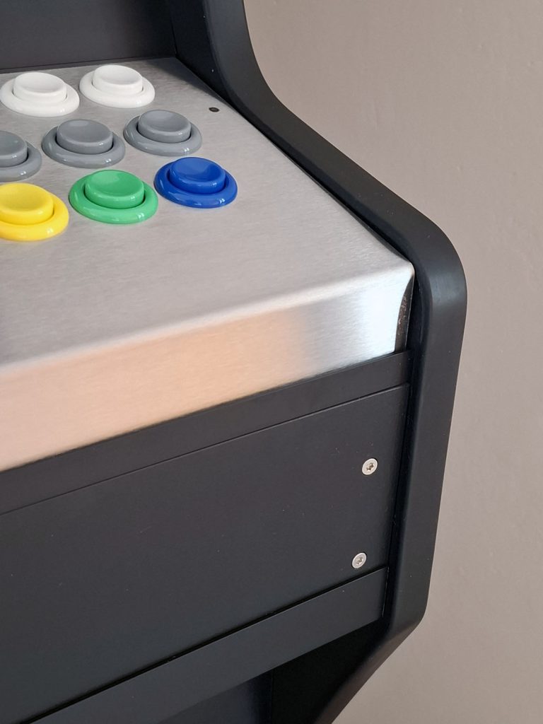 Z důvodu maximální autentičnosti jsem se rozhodl pro výrobu vlastního ovládacího panelu. Panel jsem nechal vypálit laserem z 2 mm plechu broušené nerezové oceli. Díky čelnímu ohnutému lemu je plech po celé své ploše pevný a nepruží. Rozložení pozic tlačítek a joysticků jsem převzal s nepatrnými změnami z ovladače 8BitDo Arcade Stick viz přiložený plánek. Ovládací panel je sestaven ze dvou sad tlačítek IL Super Short Arcade Concave PSL-C, dvou japonských joysticků SANWA JLF-TP-8YT s oválnou plastovou páčkou Oval Bat Top Handle a dvojice Zero Delay 1 Player Arcade USB Encoder. Barevnost spodní řady tlačítek jsem stanovil podle mého oblíbeného systému NEO-GEO MVS.