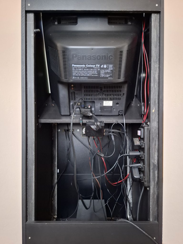 Televizi jsem do skříně zasunul z přední strany až na hliníkový doraz z L profilu. Tento profil taktéž slouží k vycentrování pozice televize. Kovovou krabičku s Raspberry Pi jsem přišrouboval v blízkosti SCART vstupu televize, neboť kabel RGB-Pi je poměrně krátký, cca 20 cm. Zapínání a vypínání celého systému (TV, RPi, ozvučení, LED podsvícení) jsem vyřešil pomocí zásuvkové lišty s kolébkovým vypínačem. Pro možnost odděleného vypínání Raspberry Pi je připojen malý USB-C vypínač.