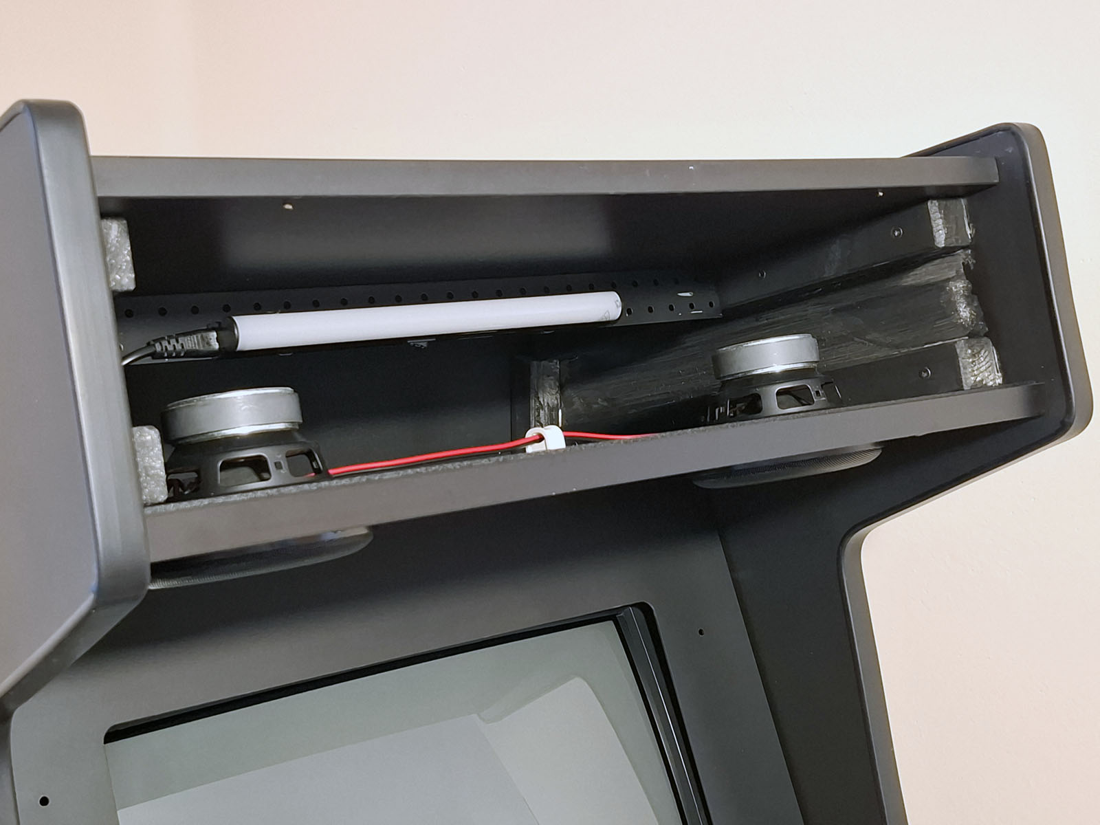 Přestože má televize vlastní stereo reproduktory, rozhodl jsem se do skříně automatu zabudovat kvalitnější ozvučení s výrazným podáním basů. Do horní desky, pod cedulí, jsem vyřezal dva otvory o průměru 100 mm a na ně přišrouboval 2 X 4″ 30W 8 ohm reproduktory. Zesilovač jsem zvolil jednoduchý, ale dostatečně výkonný Lepy 838 Hi-Fi 2.1, který kromě regulace výšek a basů disponuje také možností připojení subwooferu. Na bazaru jsem proto zakoupil starší subwoofer ze sady CREATIVE INSPIRE T6300 a ten umístil na dno skříně.
