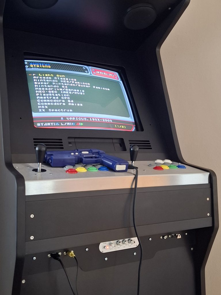 Další možností, jak vylepšit automat, je připojení světelné pistole Namco GunCon 2 pro Playstation 2. Pistoli lze použít jen na CRT obrazovkách a díky systému RGB-PI OS4 je plně softwarově podporována. K Raspberry Pi se připojuje standardním USB-A konektorem a žlutým cinch konektorem se synchronizačním signálem. Cinch musí být připojen mezi výstup SCART RGB-PI kabelu a SCART vstup televize. Ideálním řešením je vložení této SCART redukce. Pro pohodlné připojení světelné pistole a externích flash disků jsem nechal laserem vypálit ocelový čelní panel, který je osazen dvěma porty USB3-A (F) a dvěma zásuvkami cinch pro světelné pistole. Panel jsem taktéž přizpůsobil pro horizontálnímu uložení audio zesilovače LEPY 838. Pro správnou reakci světelné pistole doporučuji demontovat čelní ochranné plexisklo před CRT obrazovkou a taktéž zvýšení jasu v nastavení televizoru.