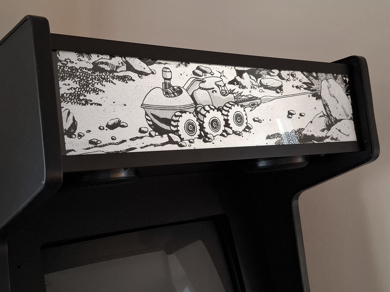 Ceduli (MARQUEE) tvoří deska z čirého 4mm plexiskla, na kterou je ze zadní strany přiložen obrázek s motivem hry Moon Patrol, který je vytisknutý v režimu černobílé bitmapy. Podsvícení cedule zajišťuje jednoduchá 31cm 4W LED lampička, napájená přímo ze zásuvkové lišty 230 V. Deska cedule je pak připevněna shora a zespodu pomocí hliníkových, černě eloxovaných „L“ profilů 20x30x2 mm.