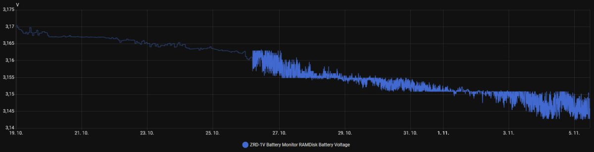 Pro začátek vybíjecího cyklu máme oba s Liborem celkem shodu a baterie se nám vybíjí asi 1,5 mV denně. To by odpovídalo asi výdrži 2 roky, ale vybíjení není lineární, předpokládám, že se pokles ještě zpomalí. Liborem naměřený odběr 15 µA by odpovídal skoro 10 letům u lepších alkalických AAA baterií. Ovšem do toho bude ještě nějaké samovybíjení a to bych měl stejně strach, že mezitím vytečou. Ať si výrobce říká co chce, mám pocit že časem vytečou baterie vždycky, otázka je jen jestli dříve nebo později 😉 Já se spokojím s tím, že baterie na ZRD-1V určitě vydrží roky.