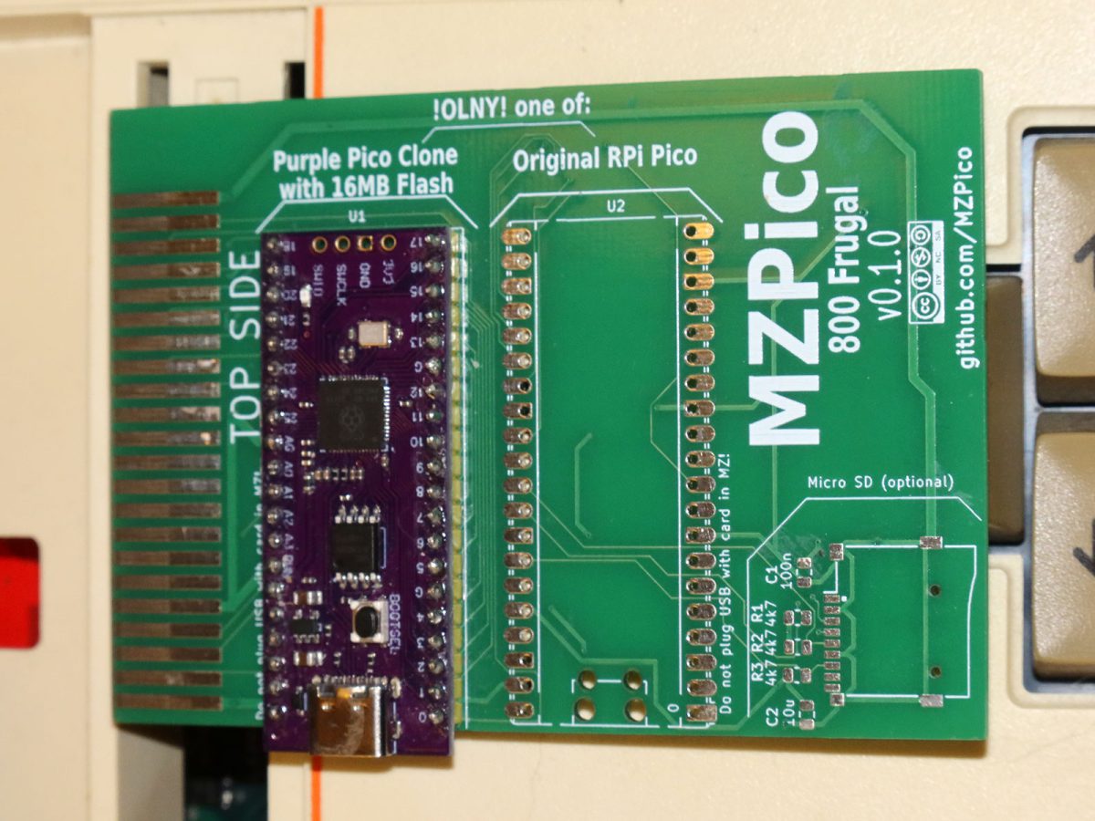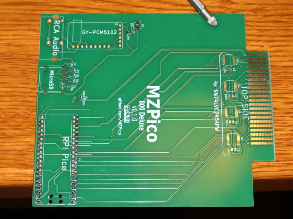 V sobotu dorazila vzácná návštěva. Přišel se za námi podívat Martin Matyáš a donesl ukázat svůj nový výtvor MZPico. V poslední době je hodně populární Raspbery Pi Pico připojovat kde k čemu, protože práci s 8-bity zvládá lehce, je to levné, pinů celkem dost, ideální hračka. Sice 5V kompatibilita IO pinů je sporná, ale prakticky LS v logika v SHARP MZ-800 chodí někde okolo max. 3,5V a to je naprosto v pohodě. Martin má dvě hardwarové verze. Jedna má jen Pico jednoduše připojené k externí sběrnici MZ-800 a to ještě adresy jen k dolním 8-bitům, ale na spoustu věcí to stačí. Karty na sběrnici jsou víceméně dělané jen na IO instrukce a jen málo HW potřebuje 16-bitovou adresaci. Druhá verze má oddělovače 74LVC245 a přístup i k horní části adresové sběrnice. Komplet datovou a adresovou sběrnici musí načítat na třikrát, ale zjevně to stíhá. Navíc, kromě SD karty, kterou má i jednodušší verze, se u Deluxe verze počítá i se zvukovým výstupem přes I2S a PCM5102.