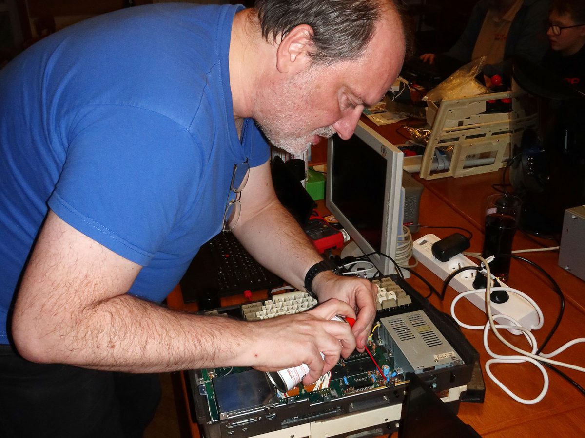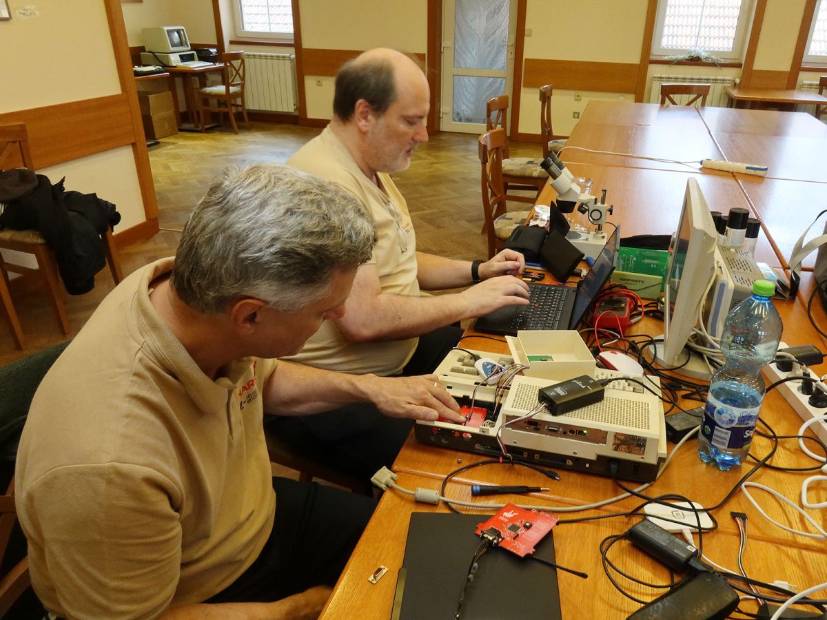 Dělaly se i drobné servisní úkony. EC1045 otestoval a rozhodil Pavlovu sestavu SAPI-1. Bohouš opravil Filipovi chrastící potenciometr v MZ-800. Má vždy u sebe svoji oblíbenou sadu čistících sprejů, tak stačilo pouze použít jeden sprej po druhém, protočit, osušit ubrouskem a potenciometr je skoro jako nový.