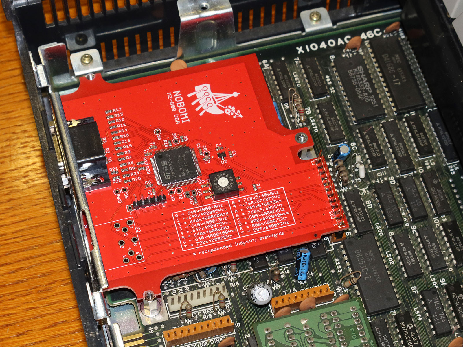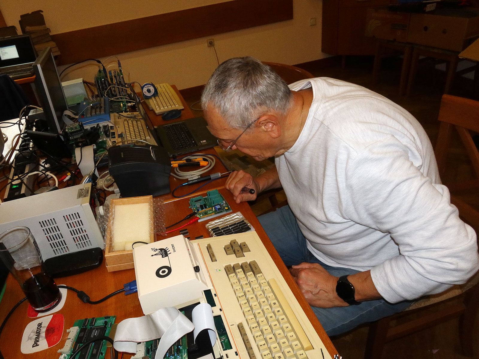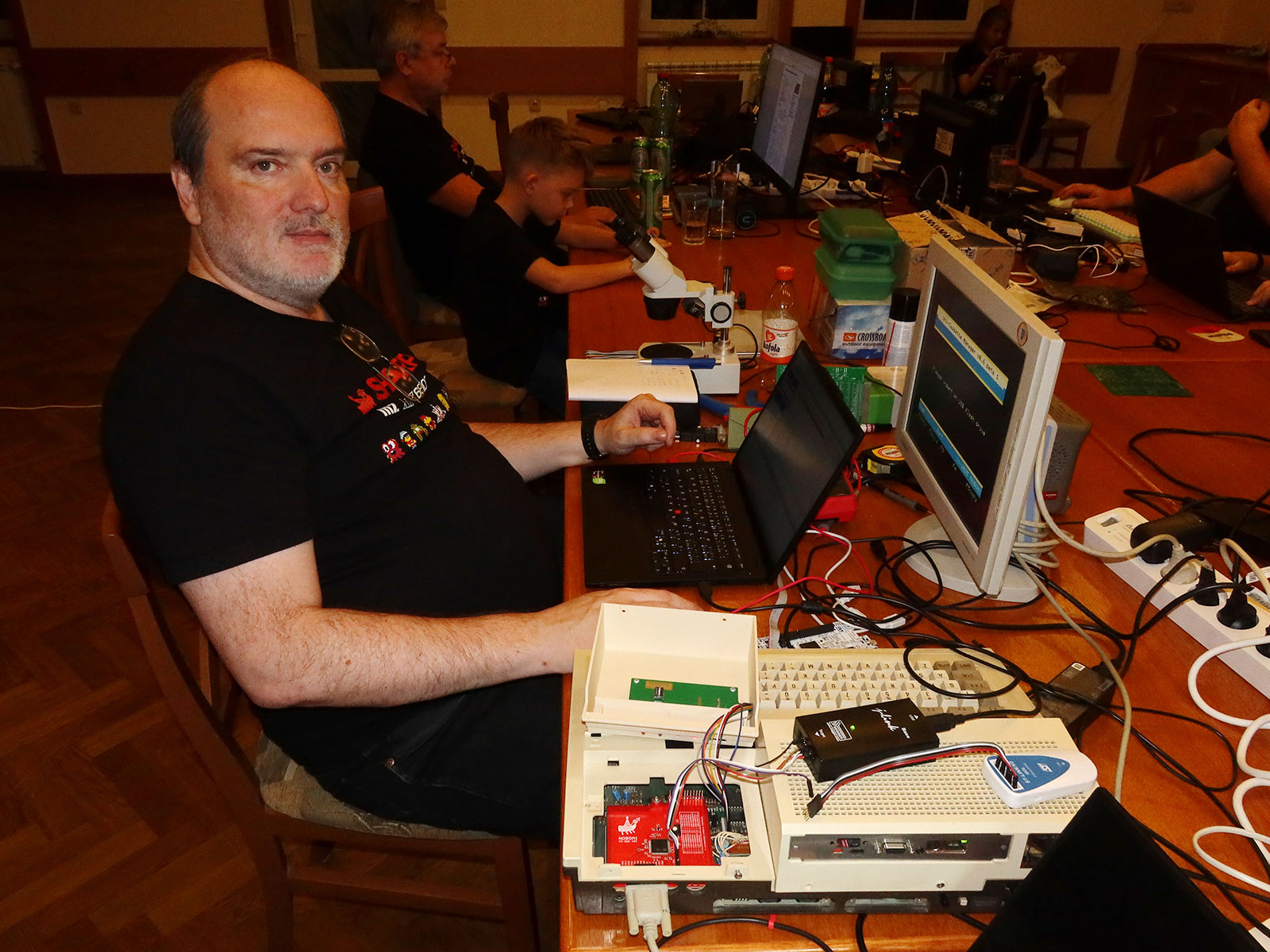 Bohouš se pustil do práce na firmwaru nové verze svého scandoubleru s STM32. Dobře funguje už nějakou dobu na MZ-800, ale Bohouš by ho chtěl udělat univerzální, aby fungoval i na MZ-700 EU i JAP a MZ-1500. To si vyžádá nějaké úpravy. Problém je, že konektor je na MZ-1500 trochu jinak zapojený a na MZ-700 i jinde umístěný. Navíc nesedí výškově umístění 8-pinové kulatého DIN konektoru. Originální modulátory mají totiž desku „vzhůru nohama“ a drží ji plechová krabička, kde je celý modulátor umístěný. Bohouš má desku umístěnou na distanční sloupky do podobné výšky jako byl originální modulátor s konektorem přímo zapojeným do desky. To je sice pohodlné, ale také to znamená, že se DIN konektor musí spustit asi o 3-4 mm níže. Na fyzické realizaci změny DPS se domlouval s Mikešem, zatímco Bohouš bude ladit software. To mu na akci už celkem chodilo, jak na MZ-700, tak na MZ-1500 v EU i JAP verzích. Dokonce to chodí i na NTSC nastavení MZ-800, kdy SHARP jede na úplně nestandardních frekvencích, protože se nezmění základní hodiny oscilátoru. Tím se dá SHARP snadno přetaktovat z 3,55 na 4,43 MHz 😉 Mikeš to dříve používal právě ke čtení disket. Sice v té době nejede normálně obraz, ale procesor sviští rychleji. Obsluha HD disket je totiž časováním velmi na hraně. Trochu jako ZX80 SLOW/FAST mode 😉