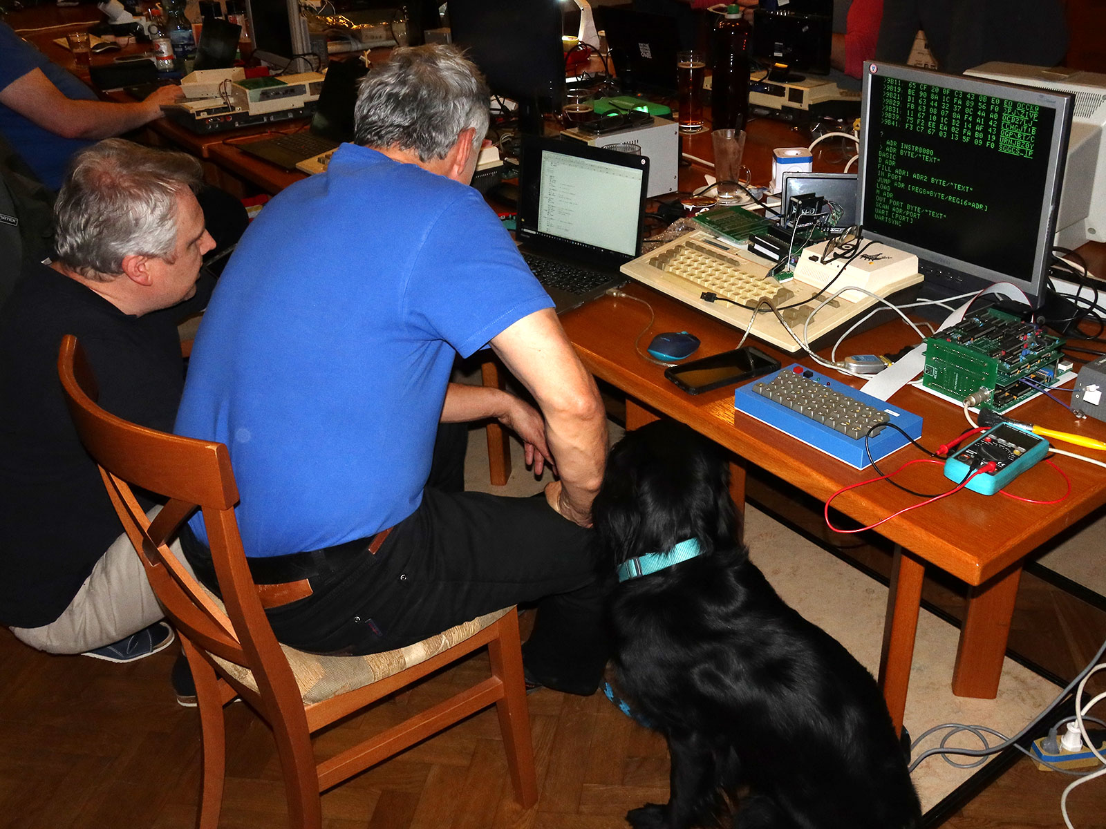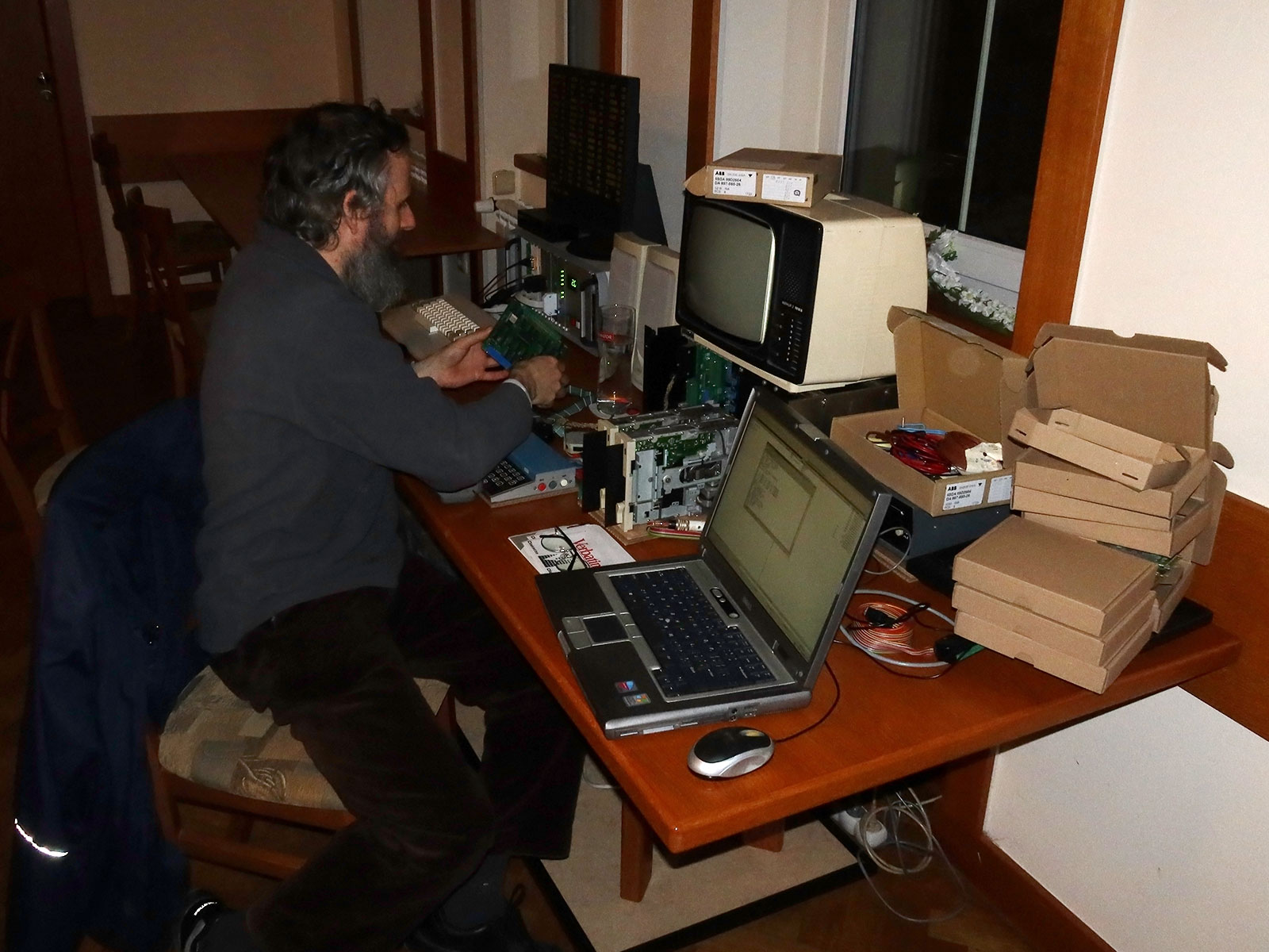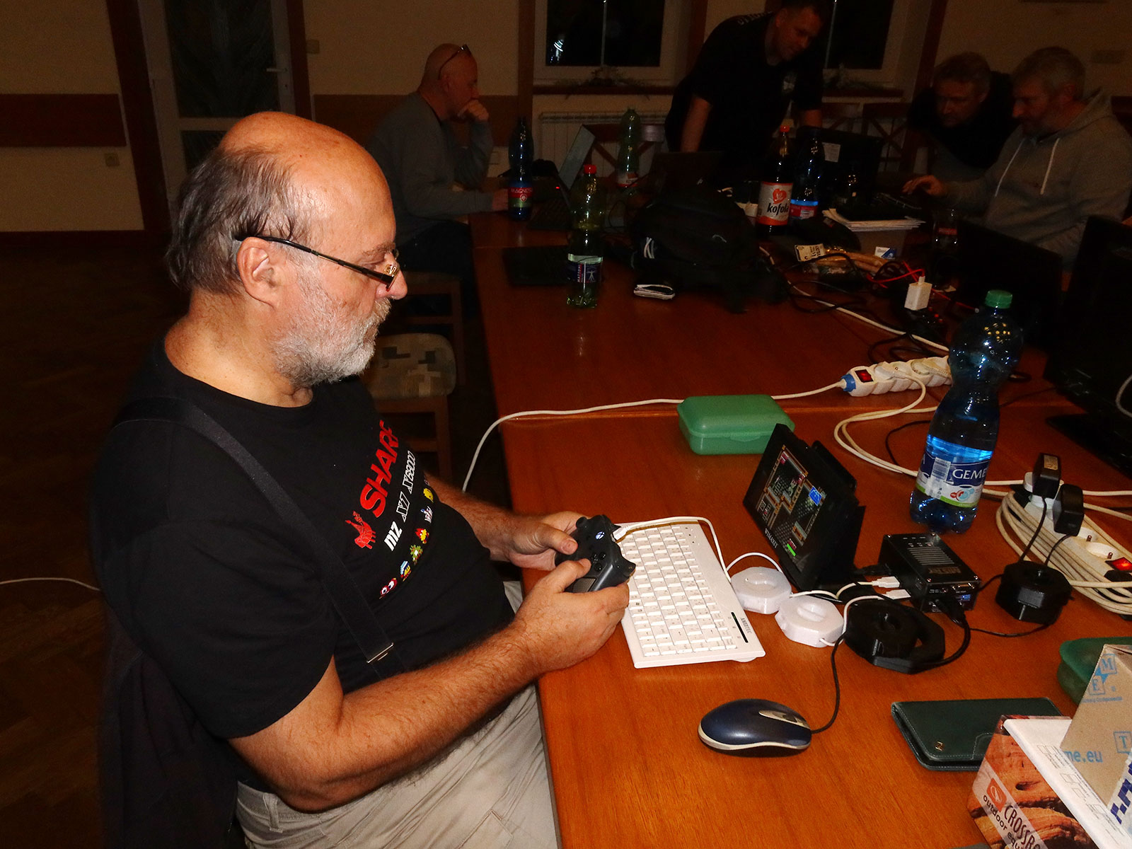 Na testování jsme potřebovali MZ-700 a MZ-1500, které jsme s sebou ovšem neměli. Naštěstí pan domácí, Pavel, má všechno a oba počítače nám zapůjčil. Bohužel ležely nějakou dobu ve skladu a tak se na MZ-700 objevila klasická závada filtračního kondenzátoru ve zdroji. A kdopak u toho byl? No jasně, zase Bohouš. Naštěstí už má spoustu zkušeností, takže s kouřícím a smrdícím zdrojem bleskurychle vyběhl mimo obytné části. I tak chvíli trvalo, než se to vyvětralo. Pavel to bral statečně. Jako správný SHARPista, mám náhradních kondenzátorů doma celý pytlík, tak jsem vzal počítač s sebou, kondík vyměnil a zdroj je zase jako nový.