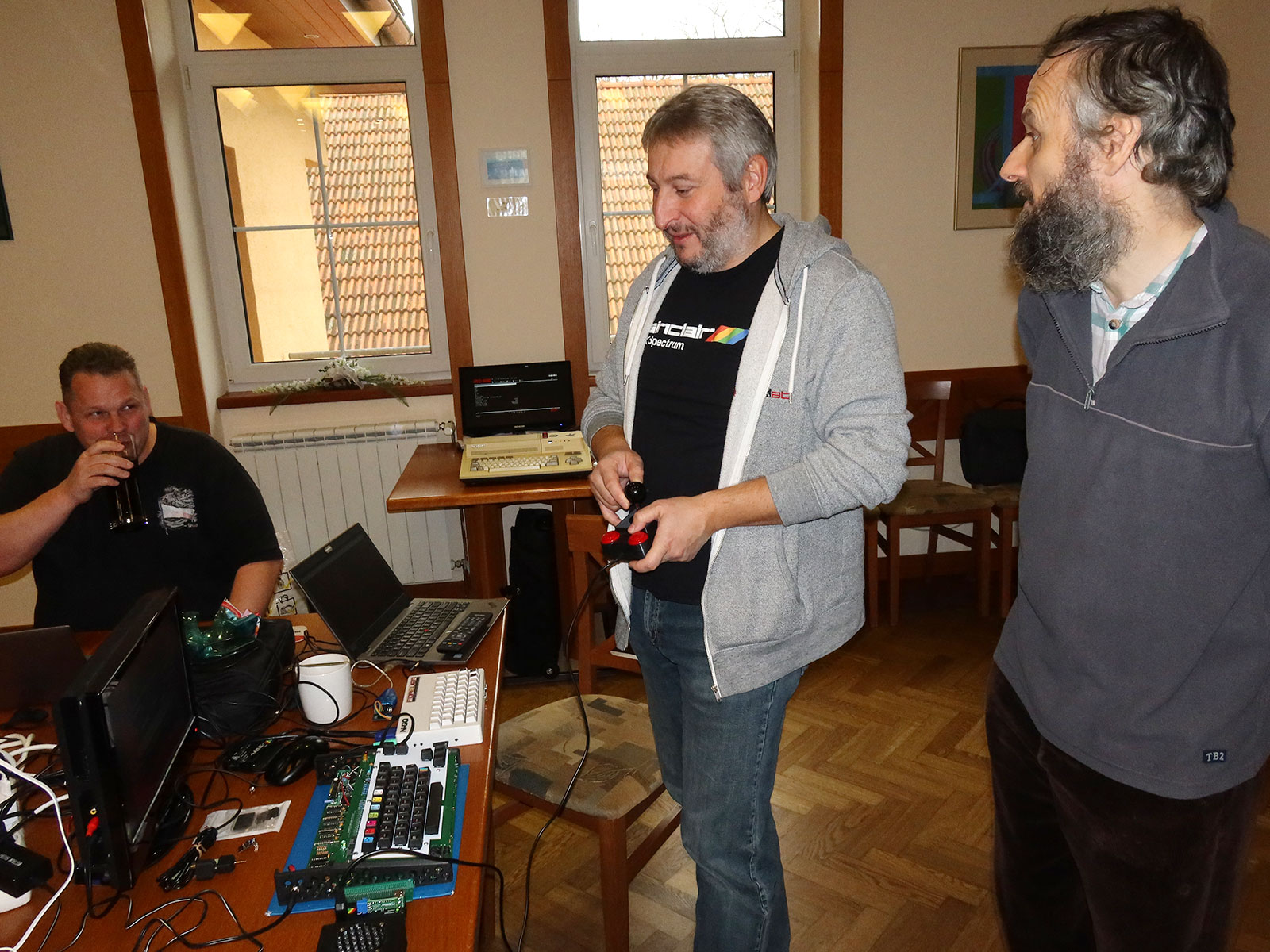 Kromě SAPI nám „konkurovali“ i Elementisté a obecně Spectristé. Ve svém hloučku vyvíjeli něco na Elementu a ani jsem moc nestíhal pátrat co. Chvíli jsem jen debatoval s Ikonem o jeho nově postaveném klonu počítače Mistrum, což je veskrze monstrózní věc. Ikon ho má postavený moc hezky a umístěný v otevřené krabičce s bočnicemi a vlastnoručně postavenou klávesnicí, fakt pěkný kousek a funguje parádně. Časování samozřejmě nezvládá všechny Speccy finesy, ale to už tak u klonů, zvláště pak dobových bývá.