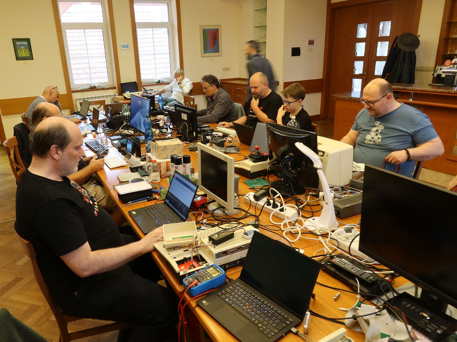 Dělaly se i drobné servisní úkony. EC1045 otestoval a rozhodil Pavlovu sestavu SAPI-1. Bohouš opravil Filipovi chrastící potenciometr v MZ-800. Má vždy u sebe svoji oblíbenou sadu čistících sprejů, tak stačilo pouze použít jeden sprej po druhém, protočit, osušit ubrouskem a potenciometr je skoro jako nový.