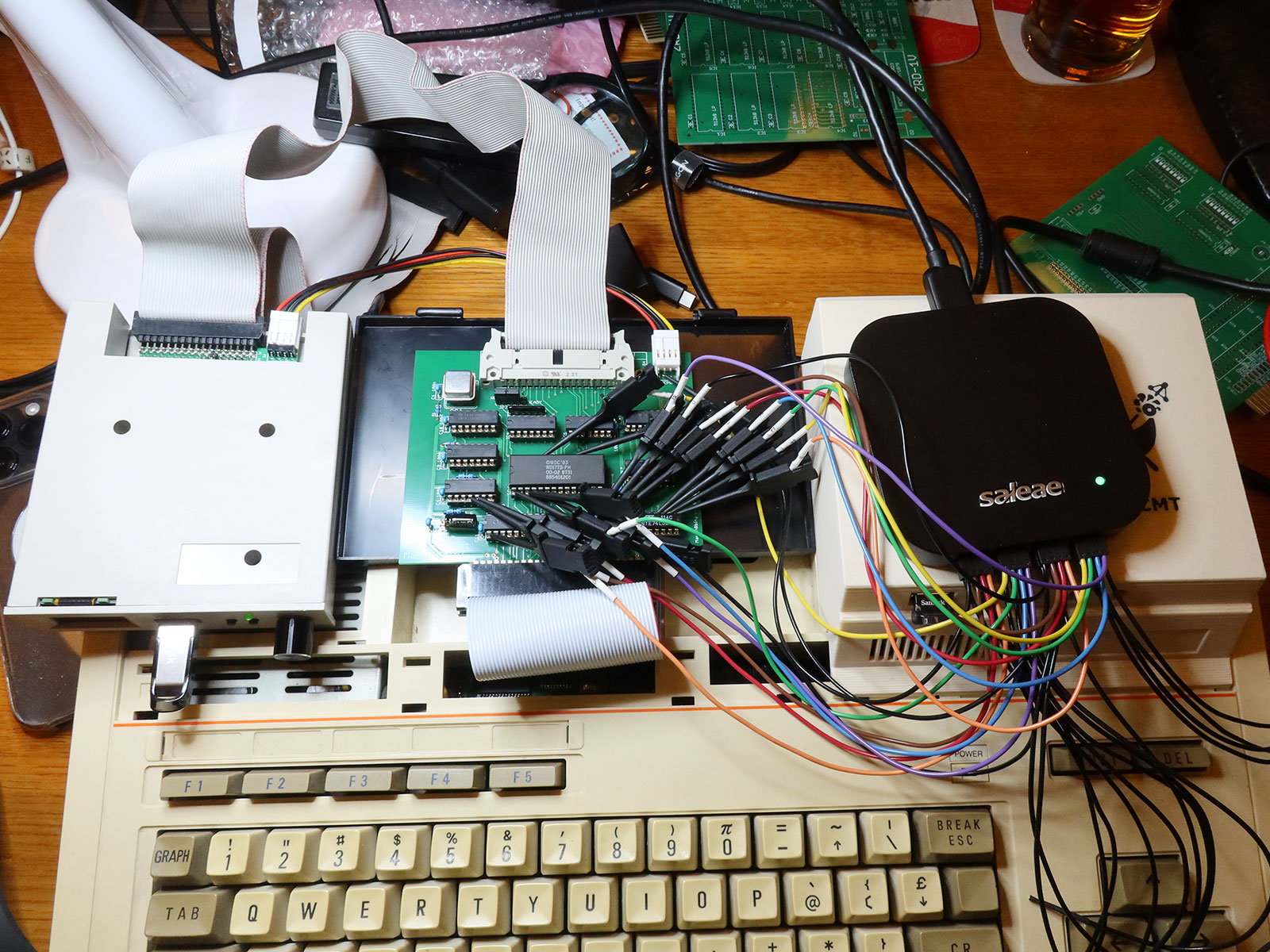 Já jsem měl v plánu podívat se na řadič disket. Rád bych udělal novou verzi řadiče, který podporuje diskety s novější verzí LEC CP/M 4.1. Takový nový řadič zatím nemáme a přitom na SCAV je většina disket založená právě na tomto systému. LEC CP/M 4.1 totiž počítá s HD úpravou řadiče, kde jednak umí řadič pracovat s vyšším bitrate a druhak používá přerušení. Udělal jsem si pokusnou verzi řadiče FDC-800 s WD1773, kde jsem přidal přepínání frekvence a možnost povolení a vyvolání přerušení. Klopáky jsem zaintegroval do většího GAL, ale úpravy nepomohly. Diskety ze starších systémů mi chodí, ale novější 4.1 ne. Zatím zkouším jen DD diskety, protože s rychlejšími hodinami to taky nemusí být jednoduché, protože WD1773 oficiálně HD s 500 kbit/s nepodporuje. Nicméně ani s DD disketami mi to nechodí, tak jsem zapojil logický analyzátor a traceoval, kde mi rutiny tuhnout. Naštěstí mám od Pavla Brázdy zdrojové kódy, které Mikeš upravil do přeložitelné a sestavitelné podoby, tak je čeho se chytit. Vypadá to, že řadič v pohodě načte první sektory, které se čtou standardními rutinami bez přerušení. Přerušení ale nastane dřív než je softwarově všechno připraveno a navíc to vypadá, že procesor je z neznámo jakých důvodů v jiném režimu přerušení než by měl být, takže přerušovací rutina zabloudí a to je konečná. Nicméně jsem se nedopátral, jak je to možné. Budu to asi muset porovnat se starší verzí řadiče s WD2793, nelíbí se mi totiž okamžik, kdy řadič vystaví DRQ dost brzo a asi musím zkusit i reálnou mechaniku. Mám totiž pocit, že Gotek s FlashFloppy, který používám na testy může být v některých okamžicích moc rychlý. Zkrátka není to jednoduché a ladit tyhle věci je docela náročné, bude to chtít nějaký dlouhý zimní večer nebo dva, tři 😉