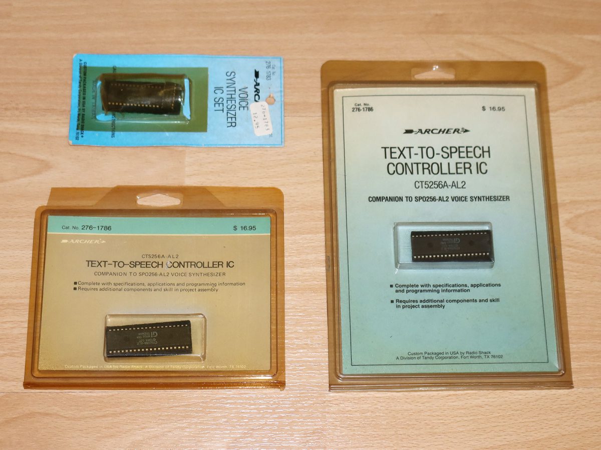 Na eBay se mi už poměrně dávno podařilo natrefit na řečové čipy SP0256-AL2 a CTS256-AL2. Čipy původně prodával RadioShack pod svojí privátní značkou Archer, tak jako spoustu dalších stavebnic, kitů a elektronických součástek. Ve své době to musel být ráj, zvláště z pohledu bastlíře začínajícího v našich nuznější socialistických poměrech. Ty kity bych chtěl mít doma všechny 😉 Stejně tak na mě už nějakou dobu čekaly v modré krabici desky na projekt CTS256A-AL2 Text-To-Speech Board od Dr. Scott M. Baker. A teď na ně konečně došlo.
