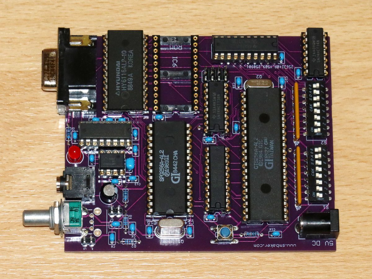 Na desce je implementován převodník úrovní pro RS-232C a také RC filtr a výstupní zesilovač s LM386. Můžete tak snadno mluvit přes sériový terminál z libovolného počítače.